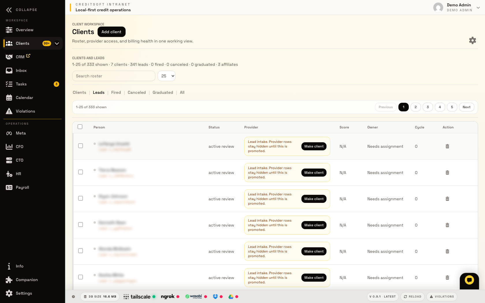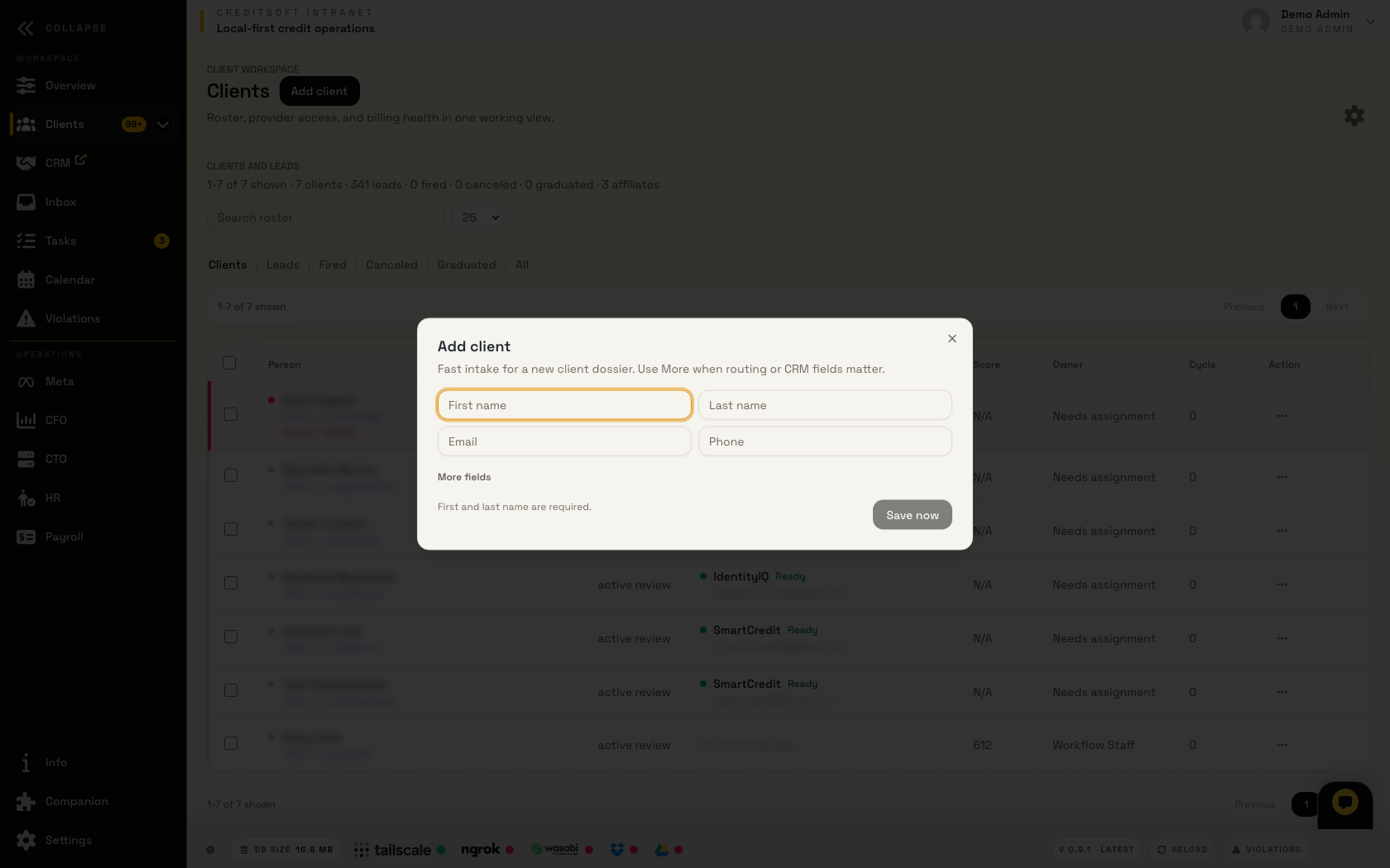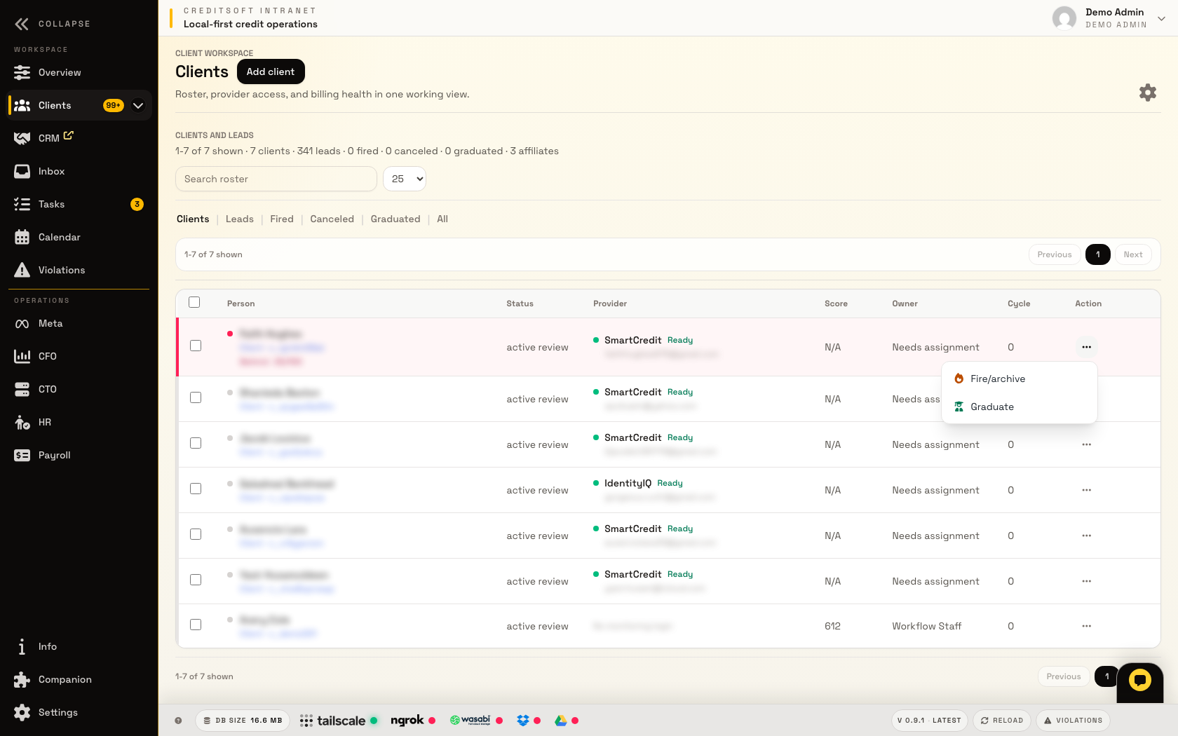 The CRM lane is where the office decides who needs attention, who is active, who is late, which provider logins need help, and what the next staff action should be. It is designed around credit repair work instead of forcing the company to pay for a separate generic CRM and glue it together.