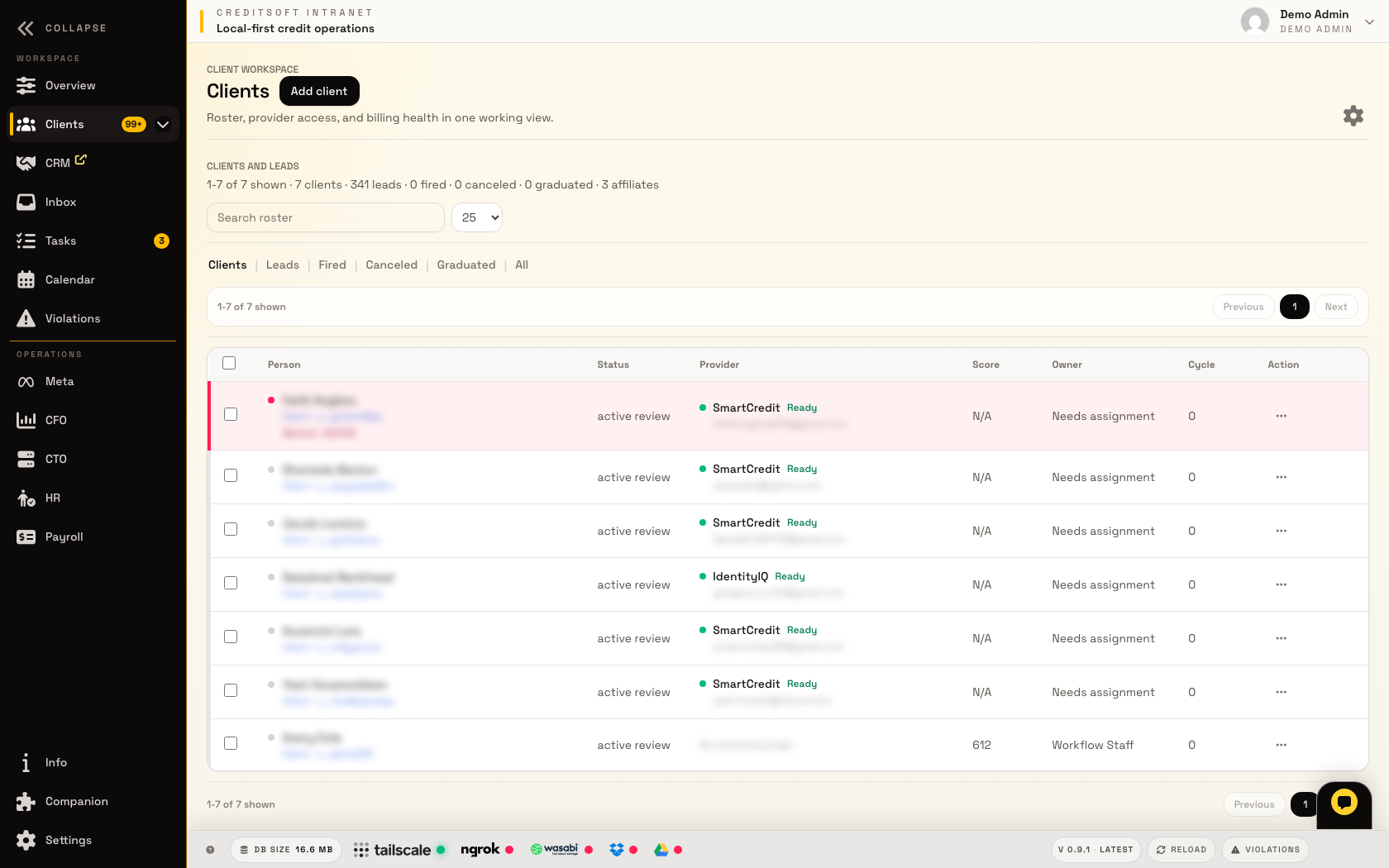 The CRM lane is where the office decides who needs attention, who is active, who is late, which provider logins need help, and what the next staff action should be. It is designed around credit repair work instead of forcing the company to pay for a separate generic CRM and glue it together.